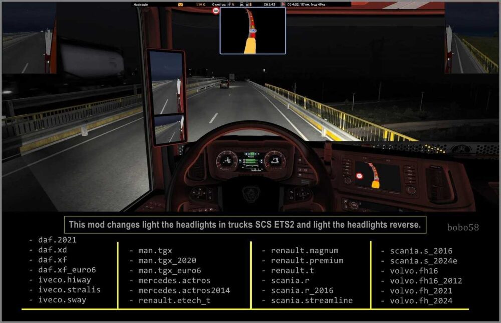 This mod changes the headlights in trucks in ETS2 and lights the headlights in reverse.