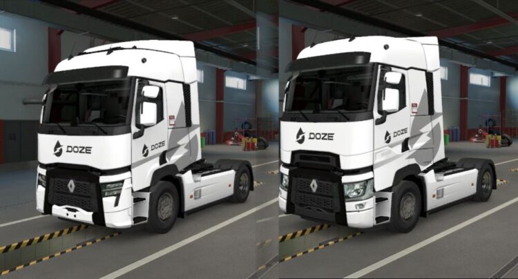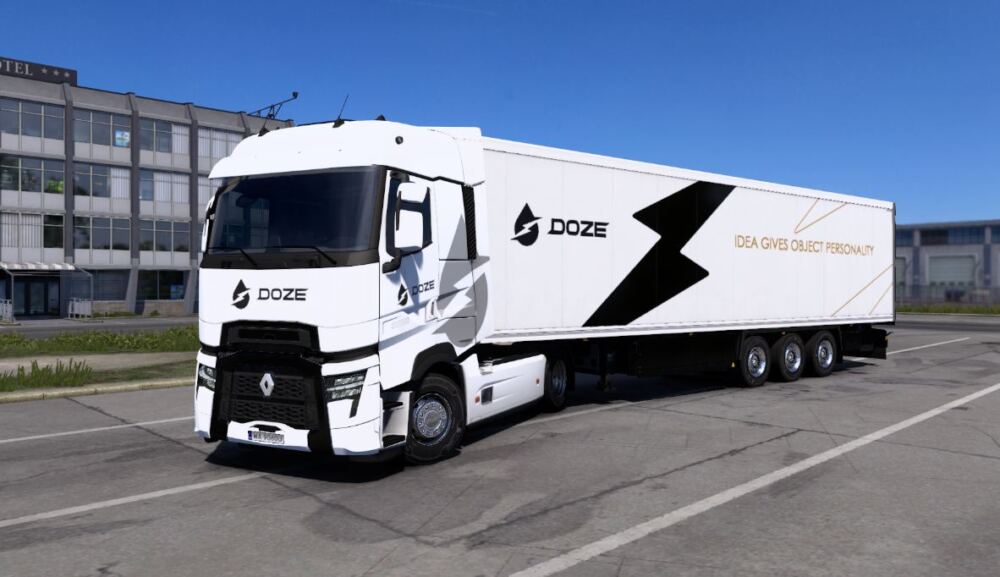 I present You Doze Renault T skin. This mod is compatibile with Renault Range T and Range T evolution in high- and normal roof configuration, fits 4x2, 6x2, 6x2/4, etc. chassis. DO NOT REUPLOAD Przedstawiam Wam malowanie Doze na Renault T. Modyfikacja jest kompatybilna z Renault Range T jak i z Rang...