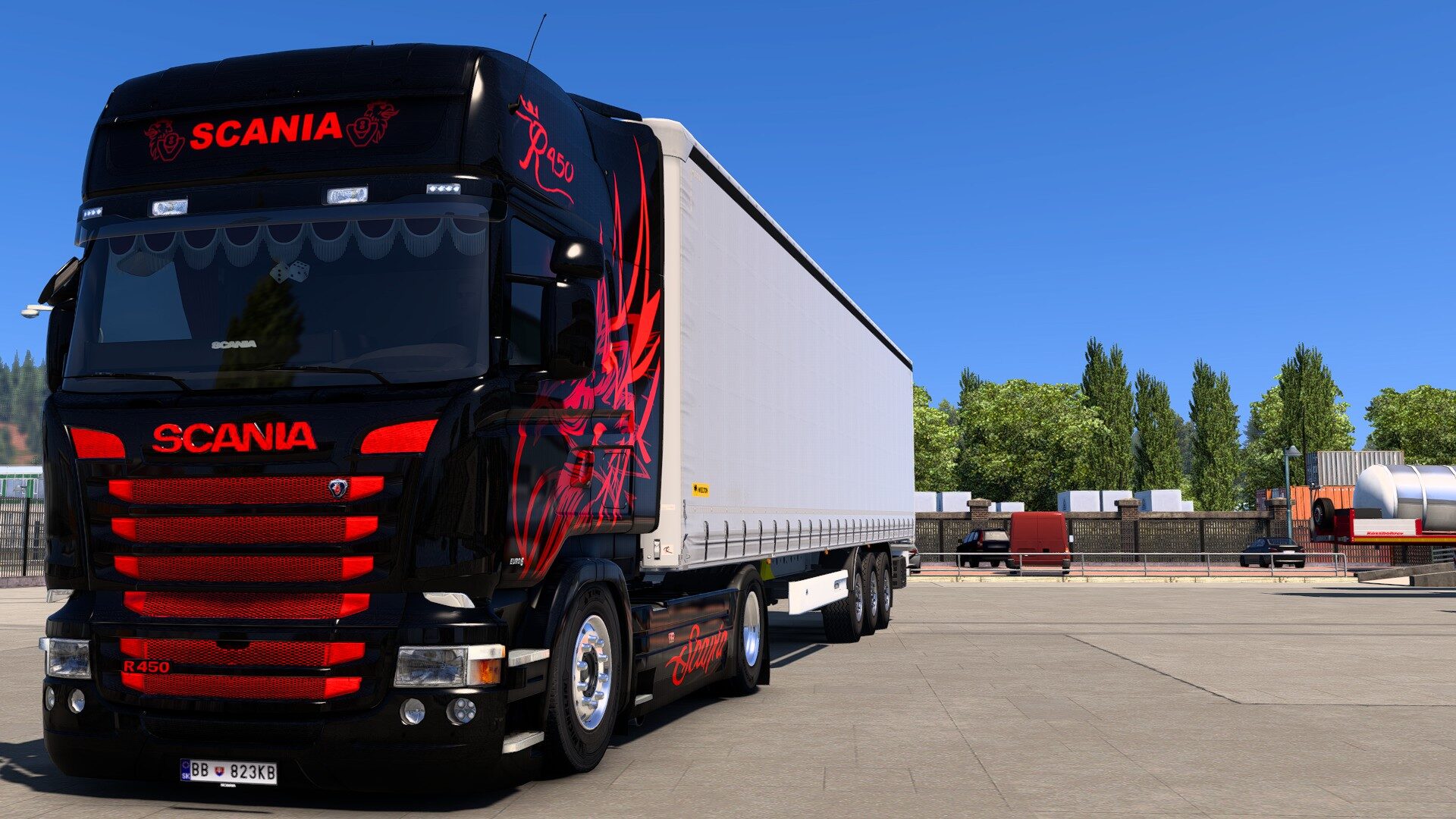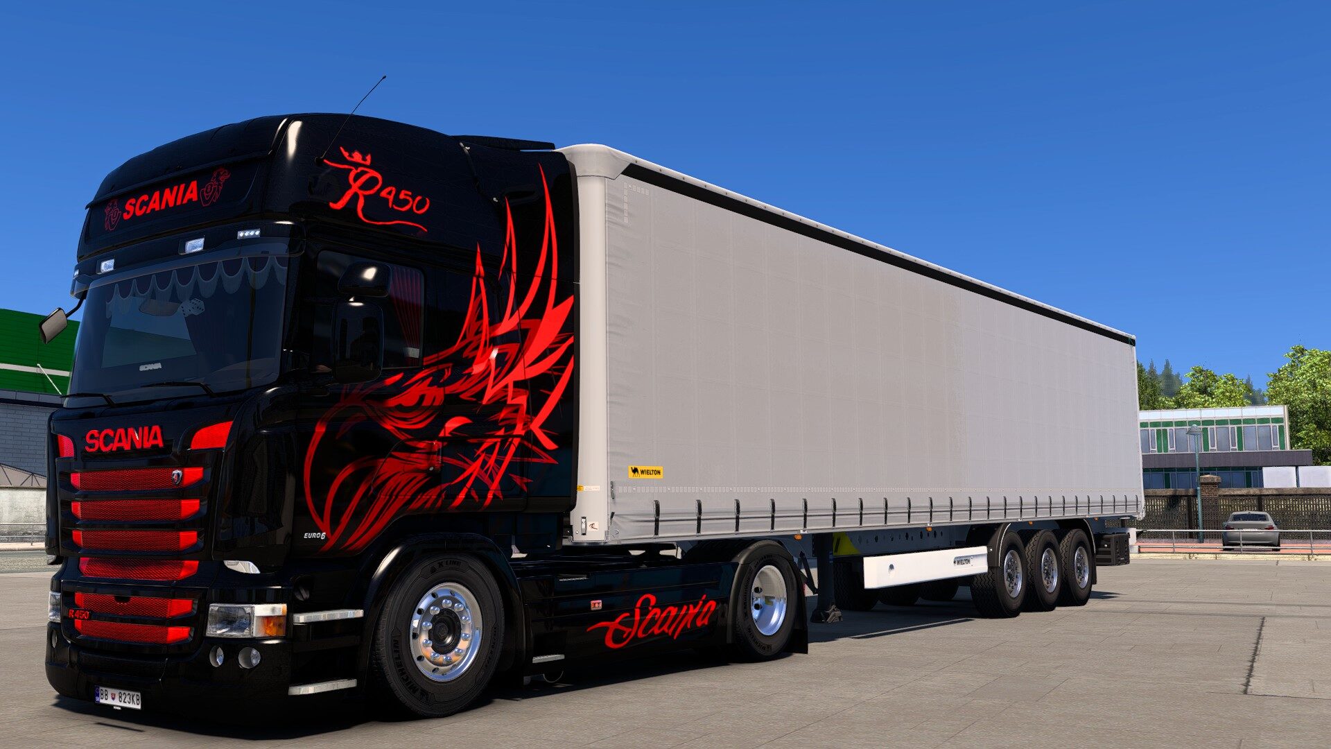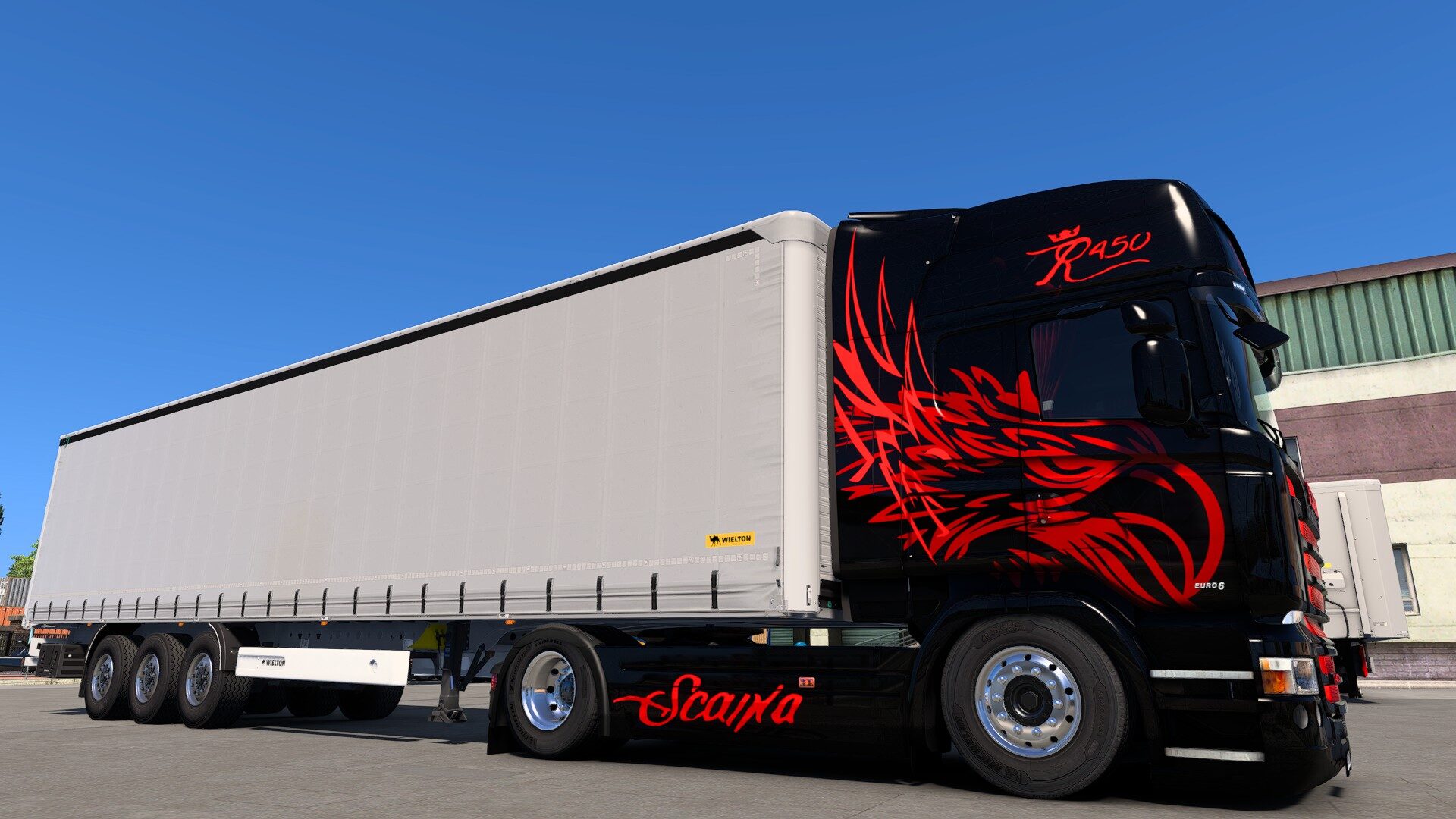 Hello, my name is OtikaPro , i am a designer of this skin in Euro Truck Simulator 2 , that skin is originally on truck SCANIA RJL 450 in real life in Slovak company called SKALA Autodoprava s.r.o, so i take pictures of the truck in real life and then i made that in ETS 2 . I made that skin before but now i fixed some things on that skin the eagle now dont have a crown on his head and more… . So thats why i called it now as Version 2 because i fixed that really same as real one.